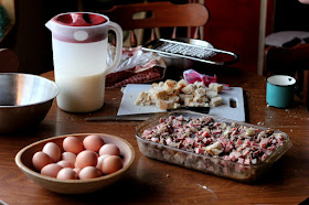 Stratas are reserved for special breakfasts around here-- birthday or company-- but they are marvelously adaptable to one's tastes or pantry, so when there are peppers or broccoli or spinach in the garden or the fridge, we throw them in, too!  They're good without meat, as well, but for a birthday breakfast, we always include the savory stuff.