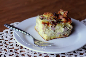 I love stratas not only because they're adaptable and delicious but also because they're supposed to be prepared the night before, which makes for an easy breakfast the next morning, but they also taste delicious cooked right after preparing, which makes a procrastinating Abigail happy.  (For reference, I've included the following picture that I took the morning of Annika's birthday.)