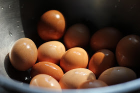 It's so easy to smoothly peel fresh farm eggs! Instead of placing your eggs in cold water, like one should do for store-bought eggs, simply bring a pot of water to boiling and then gently lower your room-temperature fresh eggs into the boiling water. Boil for about 13 minutes (or however long you prefer to boil your eggs) and then remove from the water. Proceed as usual. Peel those eggs and marvel at them. How smooth! How white!